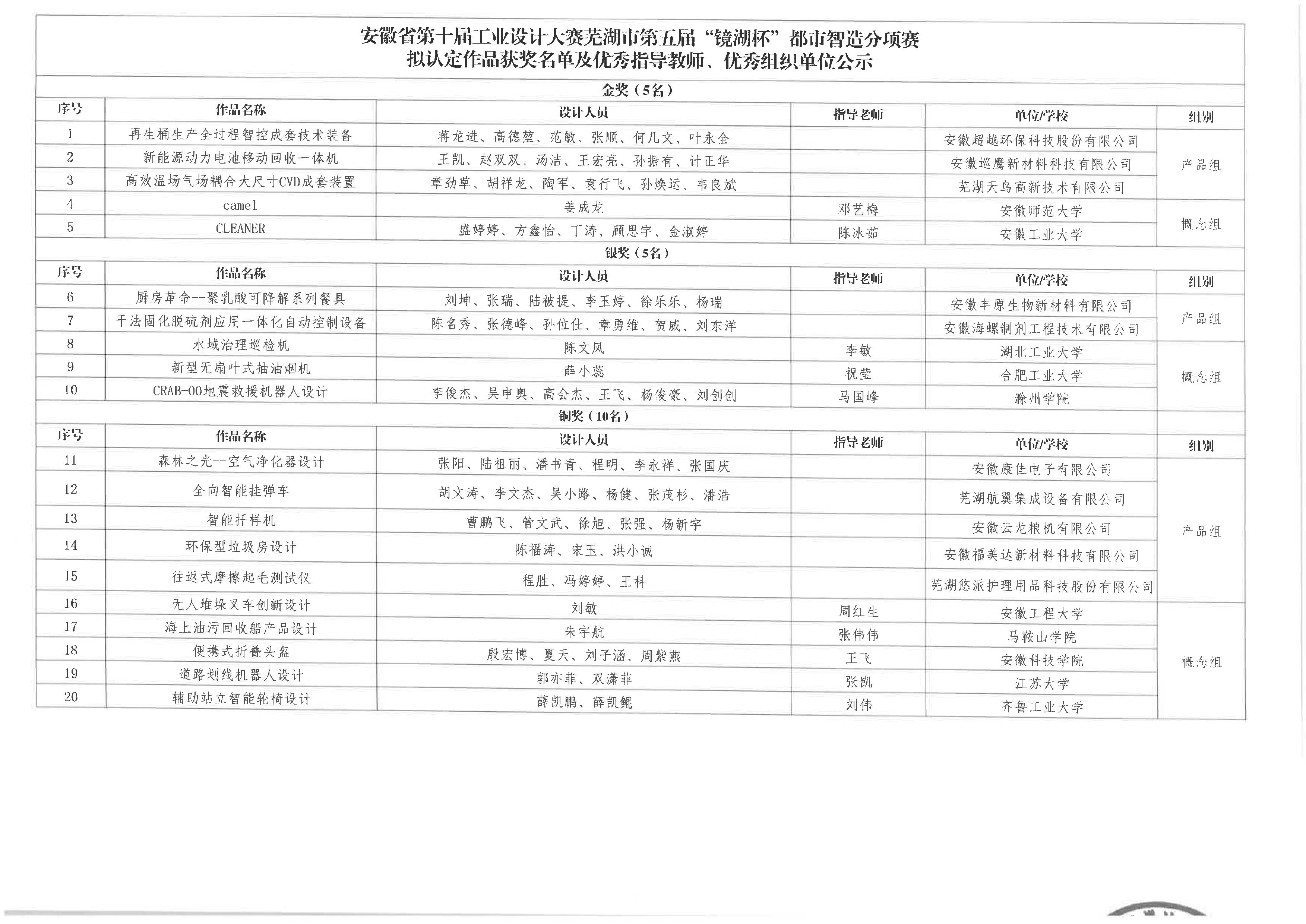 關(guān)于安徽省第十屆工業(yè)設(shè)計(jì)大賽蕪湖市第五屆“鏡湖杯”都市智造分項(xiàng)賽擬認(rèn)定作品獲獎(jiǎng)名單及優(yōu)秀指導(dǎo)教師、優(yōu)秀組織單位的公示